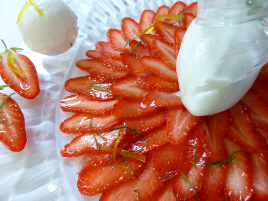 Équeutez, lavez les fraises. Taillez-les en fines lamelles, disposez-les sur des assiettes en carpaccio en rosace.