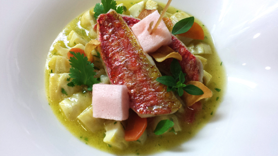 La Grecque de petits artichauts, jus émulsionné, filets de rouget en escabèche, mousseux de tomate glacé, chips d’ail.