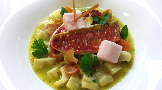 Recette de la semaine : Grecque de petits artichauts, jus émulsionné, rougets en escabèche, mousseux de tomate glacé, chips d’ail