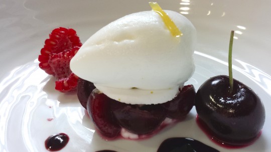 Fraicheur de cerises au vin de framboise, sorbet au citron.