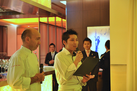 Le chef Laurent Pourcel accompagné de ses équipes et du chef Takeshi Kamoda qui veille à l’année à la qualité de la cuisine des Frères Pourcel dans la Capitale Niponne. Ils portent un toast à Sens & Saveurs et surtout aux nombreux clients habitués qui tout au long de l’année fréquentent le restaurant.