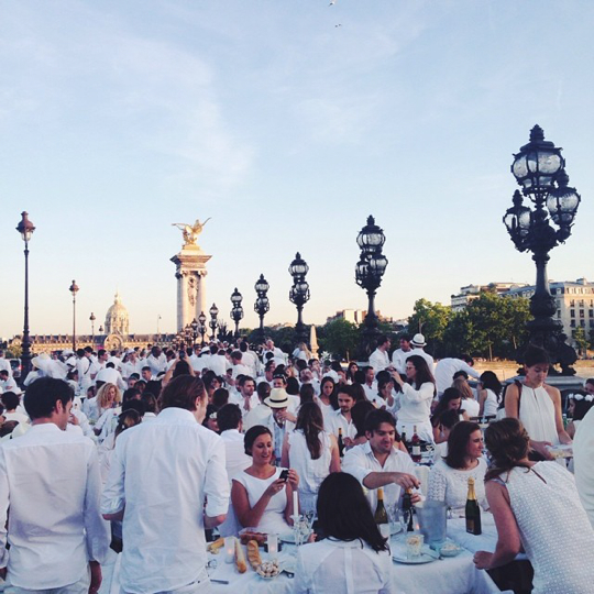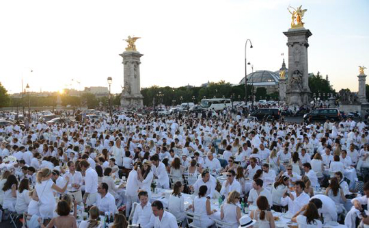 En moins de quinze minutes, des centaines de tables pliantes recouvertes de nappes blanches et de vaisselle parfois en cristal, avec fleurs et chandeliers, avaient été installées sur les principaux ponts parisiens. Le succès est international et les listes d’attente de parrainage s’allongent partout : des dîners en blanc dans les plus beaux sites sont organisés dans une quarantaine de pays. Pour la première fois cette année, Bombay, Hong Kong, Honolulu, Copenhague ou Panama City connaîtront ces rassemblements éphémères et festifs.