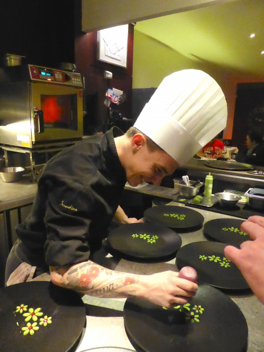 Derrière sa petite cuisine, devant les convives, le chef compose ses créations, chacun des gestes est précis et méthodique, ses préparations sont fines et savoureuses. Romain a gardé ses réflexes de pâtissier, ses assiettes sont composées en harmonie entre goûts, couleurs et textures.
