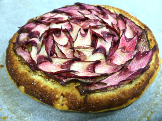 Recouvrez-la de crème d’amande sur 3mm d’épaisseur, puis recouvrez de lamelles de ruhbarbe. Tamponez ensuite à l’aide d’un pinceau de beure doux, saupoudrez de sucre semoule ou de sucre roux.
