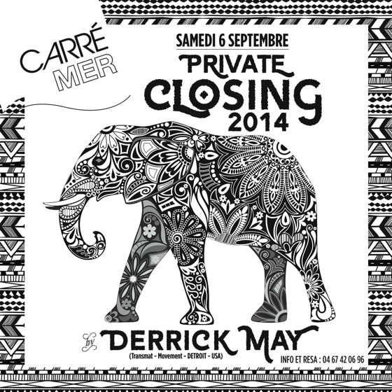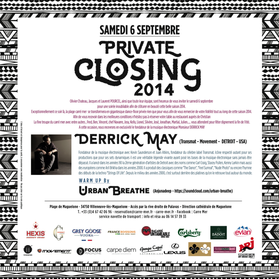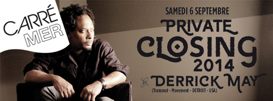 La soirée de clôture de la saison 2014 se déroulera à partir de 22h avec un DJ emblématique venu spécialement de Detroit aux USA, – Derrick May – en live vous réserve ses meilleurs sets musicaux.