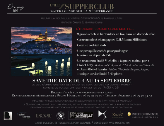 Ce « Water Lounge« , un restaurant posé sur la mer, entièrement dédié à la Food réunira, dans la baie de Marseille, neuf chefs étoilés et bartenders réputés. Champagnes millésimés, bouchées de grands chefs, cocktails… ce lieu « éphémère » s’inspire des clubs anglais, nous indique la presse.