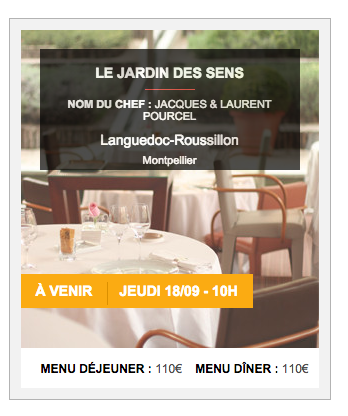 Vous y découvrirez des tables prestigieuses telles que Le Meurice à Paris, L’Oustau de Beaumanière aux Beaux de Provence, L’assiette Champenoise à Tinqueux, Hélène Darroze à Paris, Pic à Valence, Guy Savoy à Paris ….