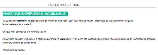 Pour découvrir l’ensemble des tables d’exception proposées dans le programme » Tous au Restaurant « , cliquez sur le Link ci-après : http://www.tousaurestaurant.com/tables-exception