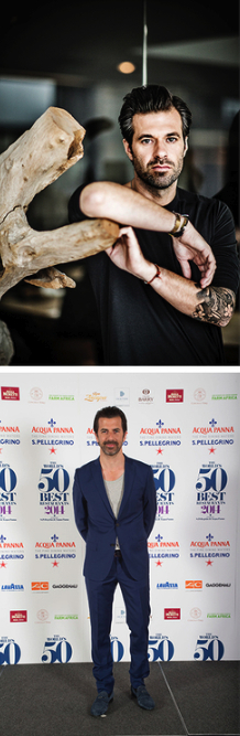 Look déjanté pour le chef américain Bowien, tendance monochrome, souvent bonnet perché sur ses longs cheveux, tatouages exubérants, T-shirts cool, blousons.