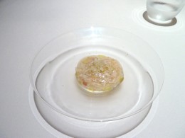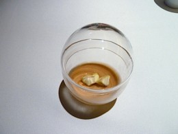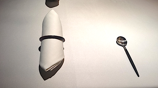 Ici à Kobé, le restaurant a beaucoup de succès, il faut environ deux mois pour obtenir une réservation, il faut dire que tout au plus 20 places assises dans la salle de restaurant. Situé dans une toute petite rue loin des artères commerciales, cela fait partie du concept, décor minimaliste, du bois, du fer, des lumières tamisées, un silence monacal, et surprise sur table en arrivant pas grand chose… tout au plus une serviette et une cuillère.