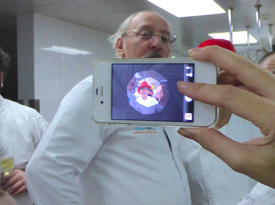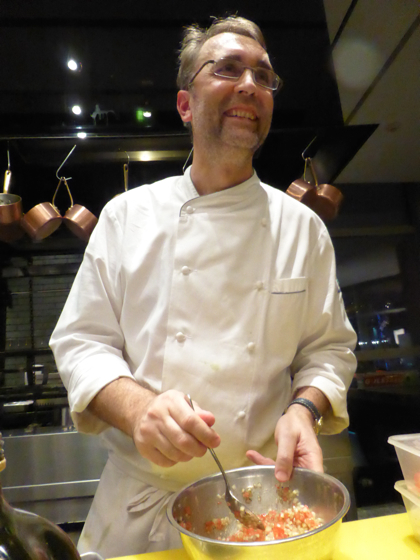 Le chef Michel Del Burgo émerveillé devant une compoté de kakis.