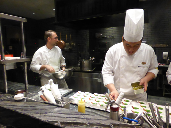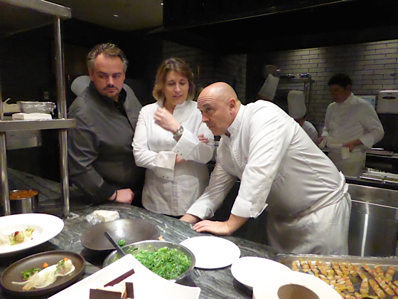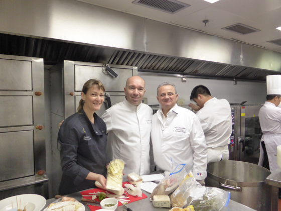Dans les cuisines de préparations les chefs Grégory Delbost et Bruno Ménard de Singapour, et la pâtissière Claire Verneil.