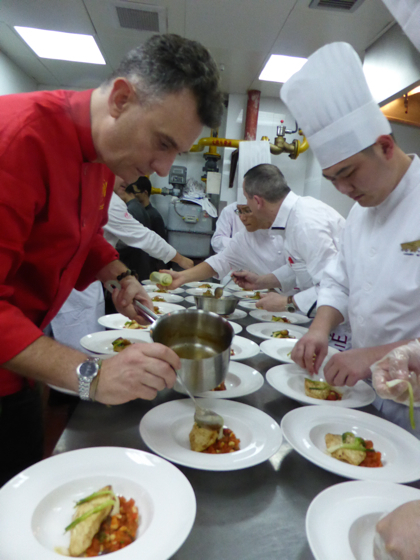 Dans les cuisines, l’envoi du plat du chef Michel Del Burgo, ici avec le chef Grégory Lourachi.