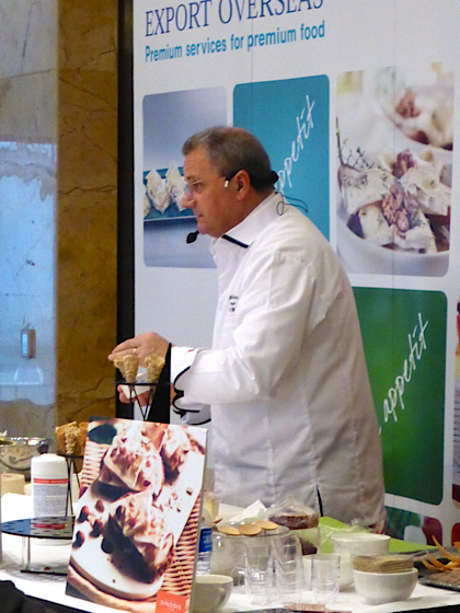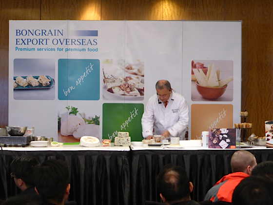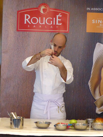 Cours magistral du travail du foie gras par le chef Régis Triglel de Moscou devant une salle comble.