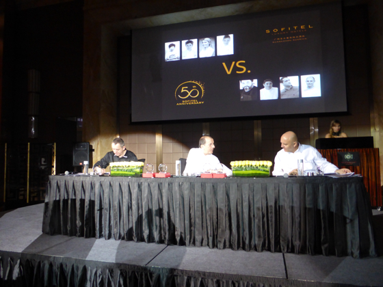 De chaque côté de la salle les équipes masculines et féminines composées de trois chefs sont déjà dans la bataille … ci dessus Nicolas Isnard, Aurélien Gransagne, Grégory Lourachi.