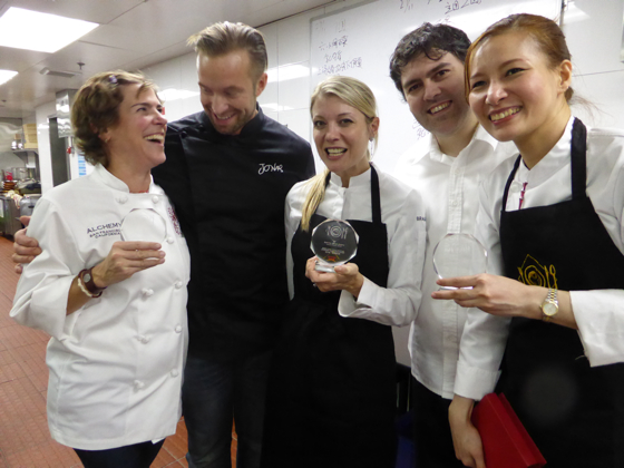 Finalement c’est l’équipe féminine qui remportera le trophée… ici le chef suédois Jonas Lungren ( Bocuse d’Argent ), Claire Vernail, Serge Viera et Maria Obsequio chef pâtissière aux Philipinne.