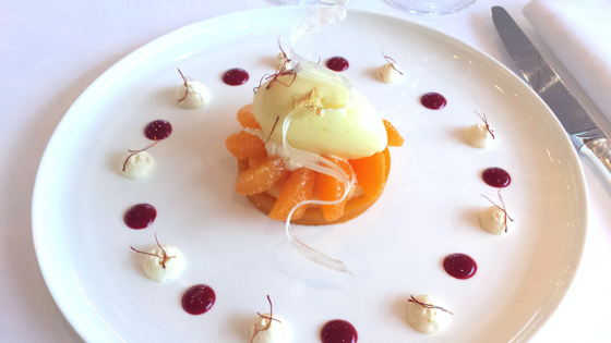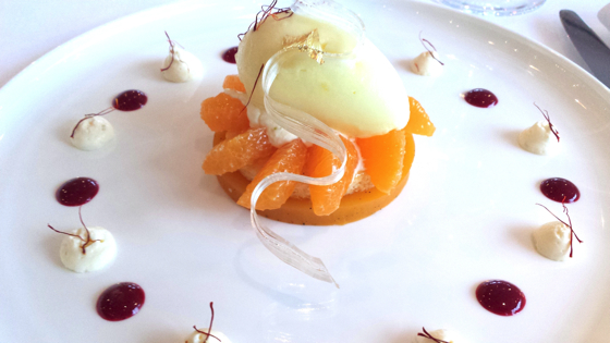 Déposez la gelée sur les assiettes, posez dessus le biscuit à la semoule, surmontez le tout des segments de clémentine. Disposez dessus de belles quenelles de sorbet safran, décorez vos assiettes de crème de citron et de coulis de framboise. Quelques pistils de safran termineront votre présentation.