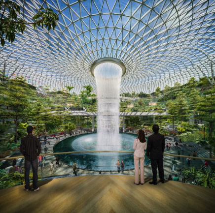 Une jungle urbaine de 134 000 mètres carrés avec boutiques, restaurants, hôtel… noyés au milieu de milliers d’arbres et de plantes étagés sur cinq niveaux. Le clou du spectacle de ce biodôme futuriste : le Rain Vortex, une cascade de 40 mètres de hauteur.