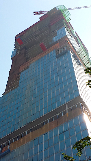 Les travaux sont en cours, l’ensemble de l’immeuble qui regroupera des bureaux, des appartements de luxe, un hôtel haut de gamme et des commerce est déjà à trois quart construit.