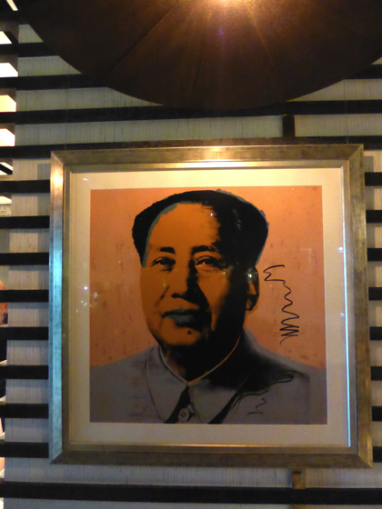 Le restaurant couvre tout le dernier étage du Mahamakom Cube, il dispose de deux espaces intérieurs, dont un le long d’un impressionnant bar. À l’intérieur, l’ensemble est cocooning, lumières douces et djette stylé aux platines. Sur les murs de vraies œuvres d’arts, comme cette impressionnante œuvre Pop Art signé Warhol estimée à plusieurs millions de dollars tout droit venue de la collection privée du propriétaire.
