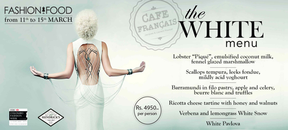 Le concept de “ Fashion & Food ” est de rassembler 6 restaurants de la capitale Sri Lankaise à forte renommée, en tant que partenaires de la Colombo Fashion Week, et de leur demander de créer chacun un menu exceptionnel sur le thème de la mode qui sera servi exclusivement durant cette semaine à leurs clients dans une atmosphère spécifiquement imaginée pour l’occasion.