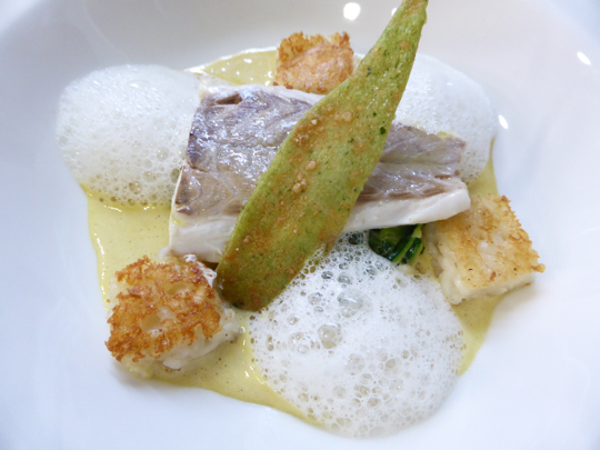 Le filet de loup au four, compotée de courgettes aux coquillages, moelleux de risotto croustillant, jus safrané, écume de citron.