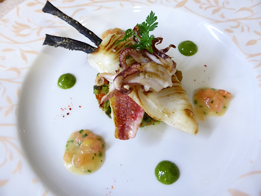 Sur une caponata de légumes, calamar grillé et filet de rouget, vinaigrette au citron confit, pesto de basilic au Parmesan, tuile à l’encre.
