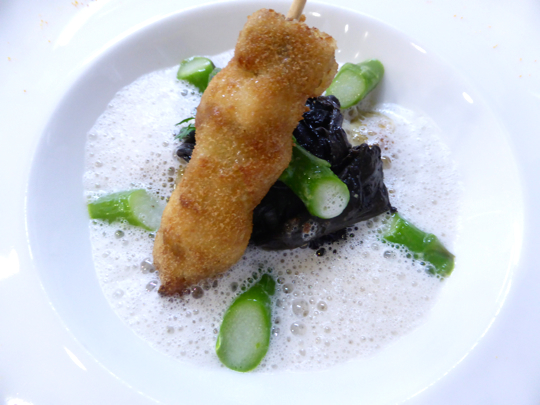 La raviole de confit de lapin aux pignons de pin, bouillon de trompettes des morts et asperges, brochette de lapin pané.