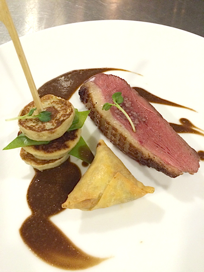 Canard français rôti, jus à l’amertume de cacao, blinis de patates douces, pastilla aux fruits secs et oignons confits.