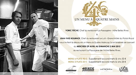 Depuis deux ans et demie le chef Yoric Tièche a pris en mains les cuisines du 5 étoiles Belles Rives à Juan-Les-Pins et notamment le restaurant gastronomique La Passagère, quand au chef Jean-Yves Bournot, il est en charge des cuisines du grand Hôtel du Palais Royal à Paris et du restaurant Le Lulli ( qui lui aussi a organisé ces repas à 4 mais en recevant le chet Yorick Tièche à Paris en ce début d’année).