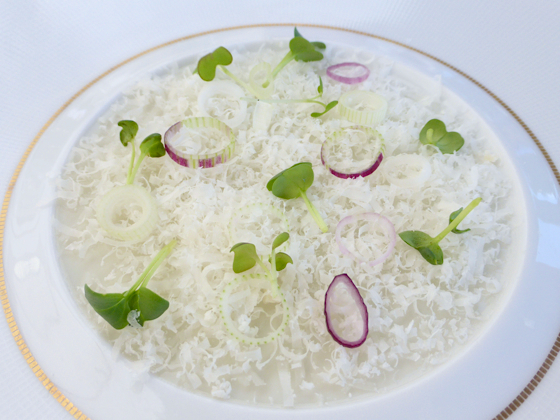 Meige de vieux parmesan, gelée de Chardonnay et fougasse.