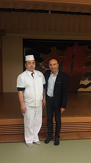 Le chef Laurent Pourcel et le chef du restaurant Ryotei Kinjohro à Kanazawa qui a dégusté la cuisine du Jardin des Sens la veille au soir au restaurant Jardin Paul Bocuse.