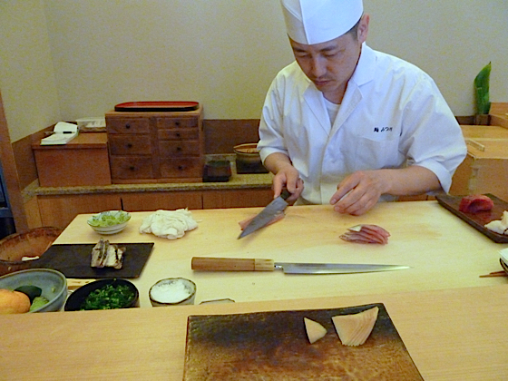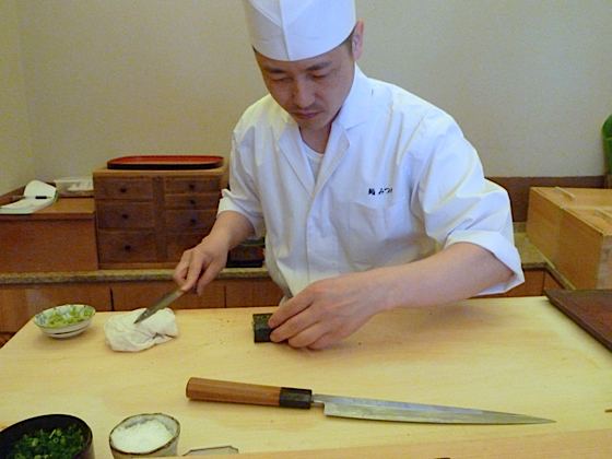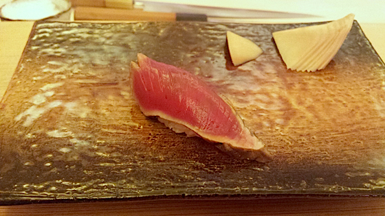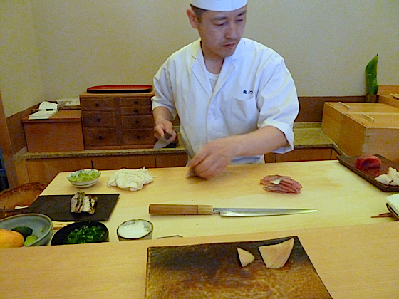 Vous arrivez dans une petite rue, sur la façade pas enseigne, une petite porte dérobée, vous pénétrez dans un tout petit restaurant, un pièce unique, 8 places assises, un comptoir, un chef. Vous ne choisirez pas, le chef fera ce qu’il a envie, enfin plutôt il composera le menu en fonction de ses plus beaux poissons. Tout est préparé à la minute, le ris est tiède, le chef avec dextérité et précision, roule, moule, façonne dans ses mains les sushis. La qualité est impressionnante, vous ne dégusterez jamais des sushis d’une telle qualité ailleurs, en plus à des prix très raisonnable, puisque à deux nous avons dépensé pas plus de 140 euros.
