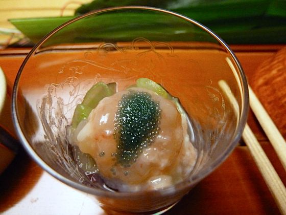 Gambas marinée à cru, ses oeufs, concombre.