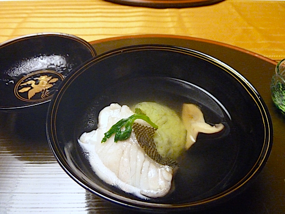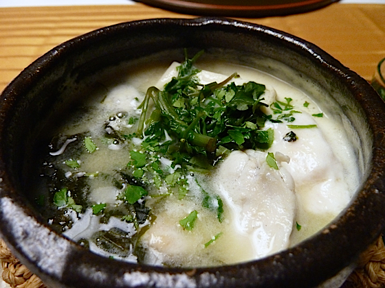 Fugu dans un bouillon de tofu, sésame, wakamé et cèleris miso.