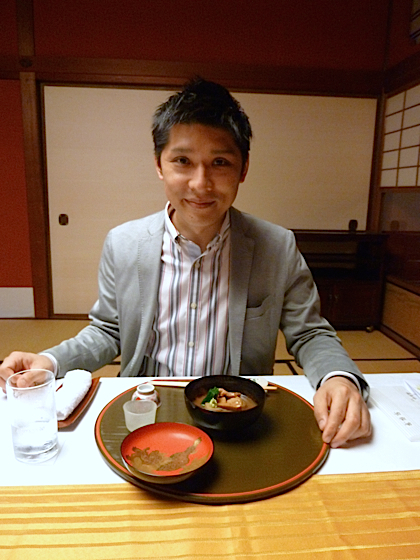 Le chef Kamoda Takeshi qui déguste le plat traditionnel de Kanazawa le Jibouni ( canard au bouillon avec pousses de bambous ).