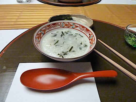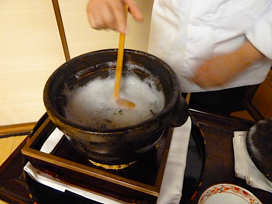 La soupe de riz, navets et huîtres ( préparation ci-dessus, service ci-dessous )