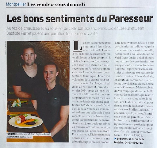 Découverte du moment, » Le Paresseur » cuisine de bistrot et d’instinct, avec aux couteaux Didier Leseur et en salle Jean-Baptiste Parret, deux ex de La Folie Douce à Val d’Isère.