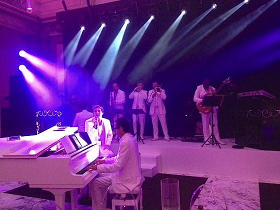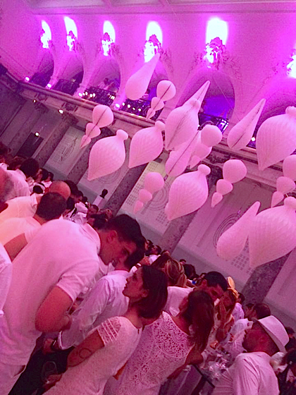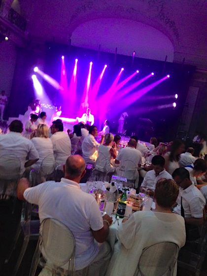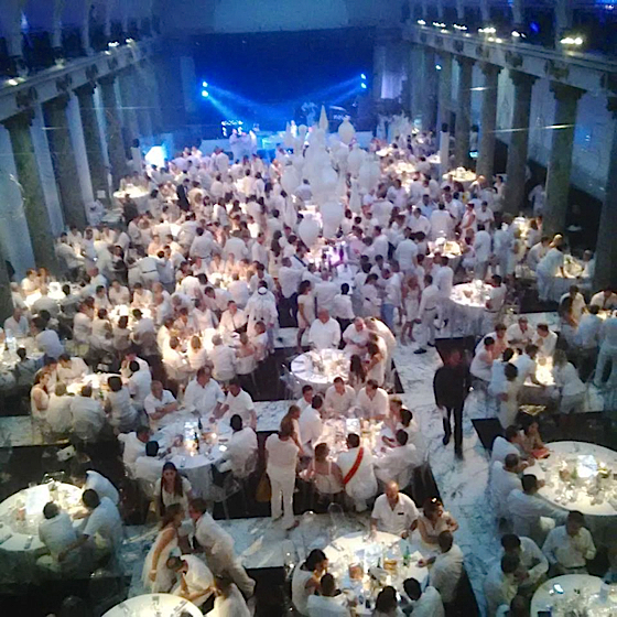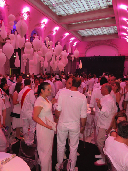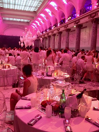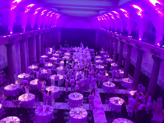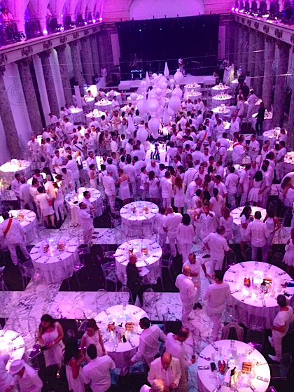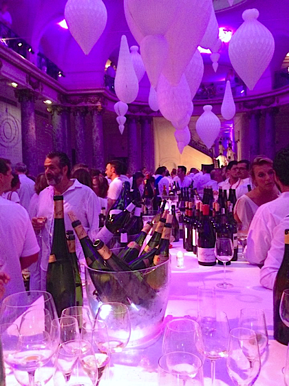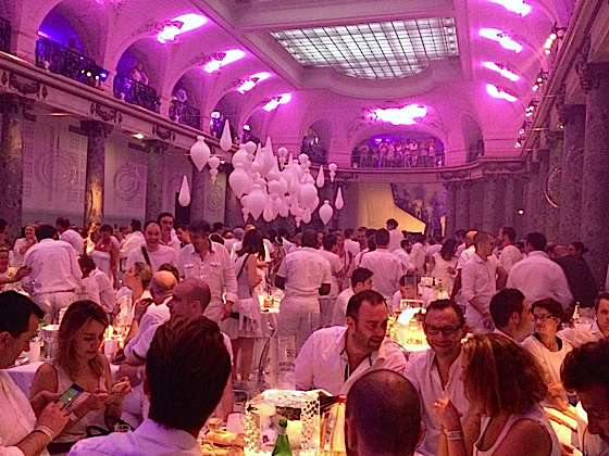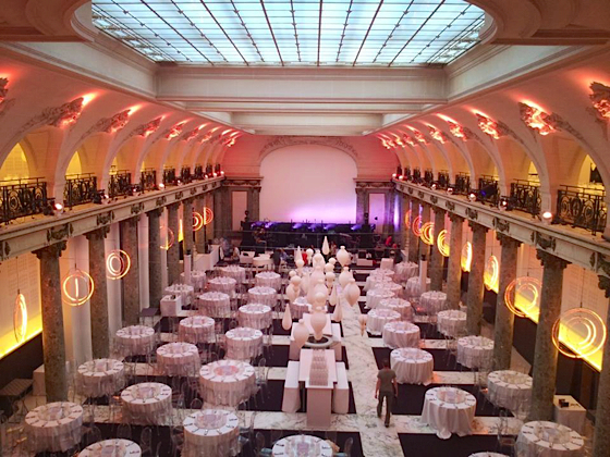 Impressionnante salle Cambon dédiée aux évènements Potel & Chabot, anciennement salle de marché d’une grande banque. Les premiers invités arrivent tout de blanc vêtus bien sûr, c’est le thème et le dress code de la soirée.