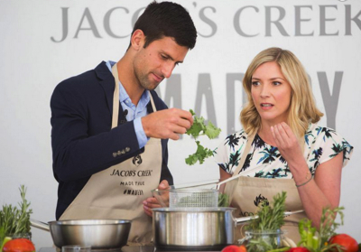 Il dispute actuellement le tournoi de Wimbledon, mais loin de la pression d’un Grand Chelem, le Serbe s’est prêté à une Masterclass de cuisine organisée par Jacob’s Creek dont il est l’ambassadeur. Ce 25 juin dernier à Londres, Novak Djokovic, costume et tablier autour de la taille, s’est plongé dans la cuisine en compagnie de l’actrice britannique Lisa Faulkner. Spécialiste du régime sans gluten dont il s’est fait le chantre, le numéro un mondial s’est mis aux fourneaux. Le tennisman a joué les cuisiniers pour les besoins de la marque qui lance sa campagne, Jacob’s Creek Made By, un breuvage commercialisé par Pernod Ricard. En cuisine, il a démontré qu’il savait y faire, héritage certain de ses parents, restaurateurs. « La cuisine est une de mes grandes passions, et elle a toujours joué un rôle important dans ma vie. Depuis l’époque où je regardais mes parents dans leur restaurant en Serbie jusqu’à ma propre expérience récente où j’ai écouté mon corps et changé mon régime et mon style de vie« , a-t-il déclaré à Pure People. Copyright Photo Acaba