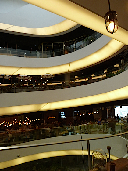 À l’intérieur du bâtiment une spirale que l’on grimpe à pied, le long de cette allée en colimaçon les enseignes de restaurants, une bonne trentaine, chacun des restaurants est indépendant et propose une formule de restauration différente.