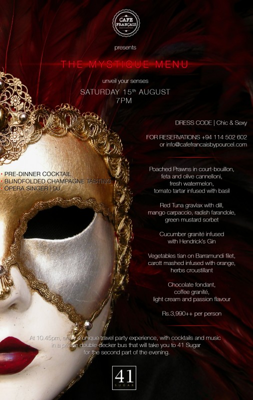 Samedi 15 Aout le Café Français à Colombo s’associe à 41 SUGAR le bar-Club lounge le plus trendy de la capitale Sri-Lankaise pour créer l’événement lors d’une soirée « Eyes Wide Shut « Cocktail & Music.