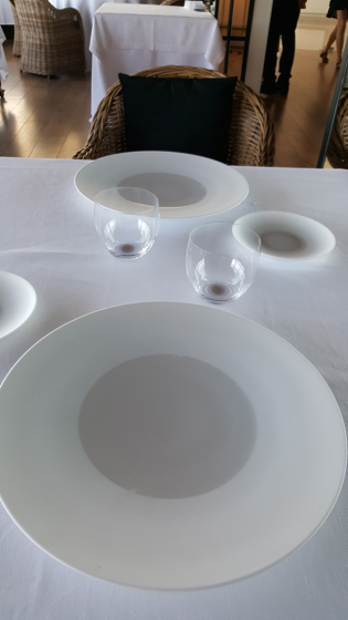 À table, tout est blanc, mise de table très dépouillée, la couleur arrivera par la suite.