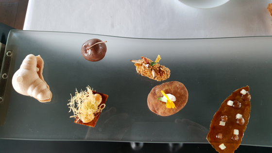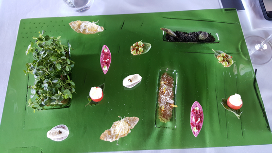 Le menu est structuré sur trois thèmes différents – Le Jardin – La Mer – La Forêt -, les trois thèmes se déclinent sur trois impressionnants plateaux tapas, à chacune des fois intercalé de plats. Au total un bonne trentaine de préparations servies à un rythme soutenu et réglé comme une horloge.