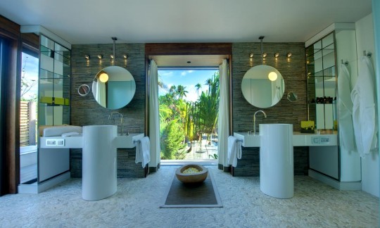 Au milieu des palmiers, les chambres sont nichées dans la végétation, surplombent un marécage ou s’ouvrent sur la barrière de corail et le lagon. Le resort a une capacité à être proche du zéro émission de carbone. 2 800 panneaux solaires fournissent l’île en électricité, les piscines sont alimentées en eau de pluie et en eau de mer désalinisée. Les déchets organiques sont recyclés, les bouteilles de verre pilées et répandues dans les allées, la climatisation puisée au fond de la mer, les eaux usées traitées dans un bassin de sédimentation. L’hôtel peut ainsi se targuer d’être hors norme pour le développement durable.