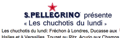 L’eau San Pellegrino longtemps et toujours indissociable de classement des 50 meilleurs Restaurants du Monde ( Fifty Best ), continue son chemin dans l’univers de la gastronomie française. Souvent tâclé pour être le partenaire du très controversé classement international décrié par la presse française, la marque du groupe Nestlé pose petit à petit ses jalons auprès des réseaux d’influences de la grande cuisine française. Après être devenu sponsor officiel du Bocuse D’or, et accompagner le mini guide » Les Étoiles du Michelin 2015 » sorti au mois de dernier, voilà donc la rubrique du lundi » Les Chuchotis du lundi » du chroniqueur gastronomique Gilles Pudlowski sur son blog » Les Pieds dans le plats » présentée par l’eau italienne San Pellegrino. Les mentalités évoluent forcément !