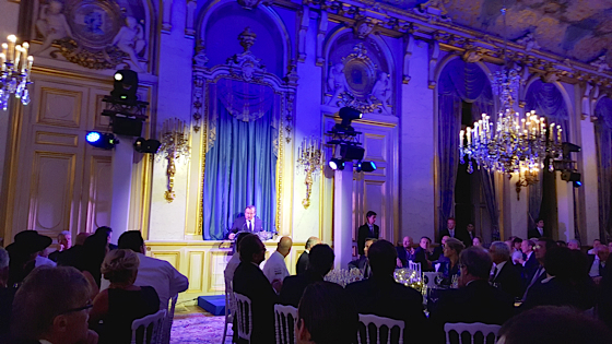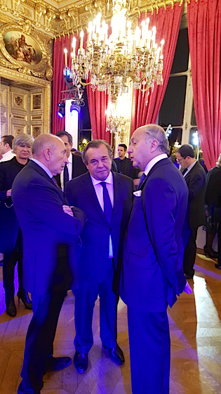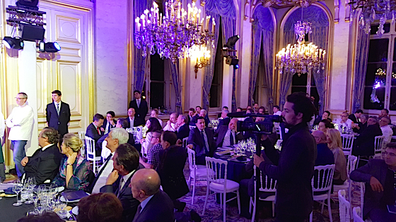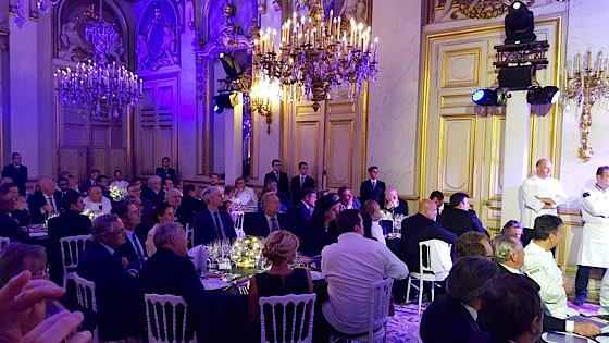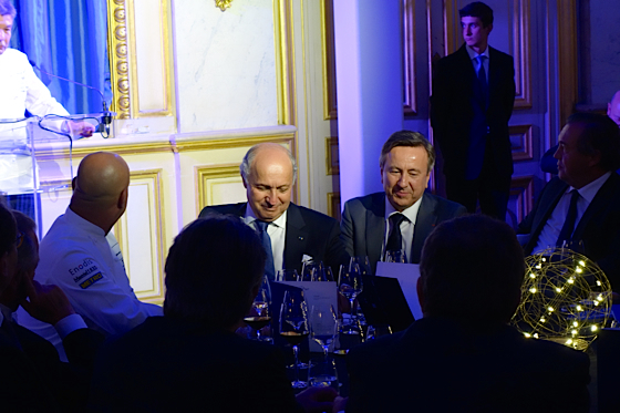 Le dîner était donné par le Ministre des Affaires Étrangères et du Développement international Laurent Fabius, par Olivier Ginon Président de GL Event’s organisateurs et propriétaires du Sirha et Jérôme Bocuse, président du Sirha.