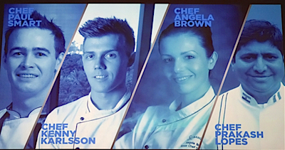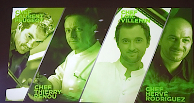 Les premiers plats arrivent, les chefs les présentent au jury, ci-dessus les chefs Chris Salans, Laurent Peugeot et Hervé Rodriguez.