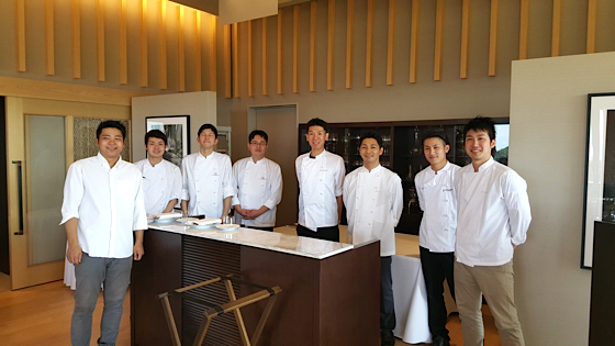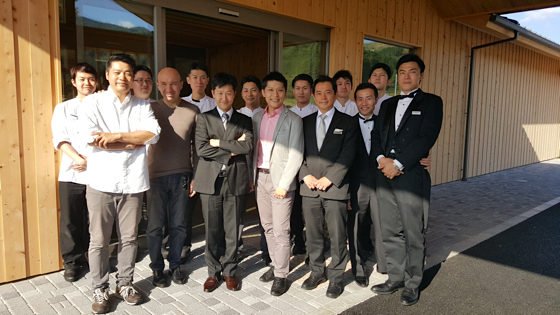 Le chef Laurent Pourcel en visite au Japon, s’est rendu sur place pour rencontrer les équipes de l’Auberge de Plaisance, ci-dessus en compagnie des équipes de salle et de cuisine de l’établissement.