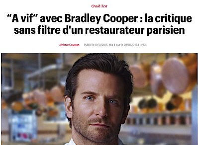 Télérama est allé demander au » volubile » chef Pierre Jancou son impression sur l’interprétation de Bradley Cooper dans son rôle de chef dans le film de John Wells. Le chef n’y va pas par 4 chemins : » Bradley Cooper, est un bon acteur mais qui fait trop poupon pour avoir vécu la vie qu’il a vécu dans le film. Si vraiment tu t’es shooté à l’héro et que tu a fini par ouvrir un million d’huitres à la Nouvelle Orléans, t’es un peu plus marqué. » … « Dans ce milieu, tu te grilles facilement et tu as du mal à te décrotter d’une réputation, donc son histoire de come back n’est pas très crédible. C’est un milieu qui n’oublie pas, assez mesquin : ma réputation des années 90, on m’en parle encore en 2015. Si tu travailles dans la haute gastronomie, tu ne te relèves pas d’un passé dans la drogue comme Bradley Cooper dans le film. Ce qui ne t’empêche pas d’être rock’n’roll, et de faire un restaurant bistronomique en t’éclatant : j’en suis, je crois, un bon exemple. »… au moins c’est clair !